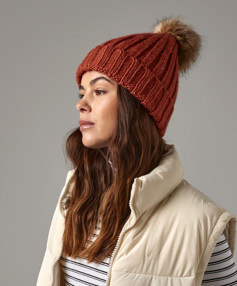 Umschlag, Pompon Ton-in-Ton, grober Rippstrick, Pompon aus Kunstfell, weicher Griff, TearAway Label, Handwäsche, nicht trocknergeeignet, nicht chemisch reinigen