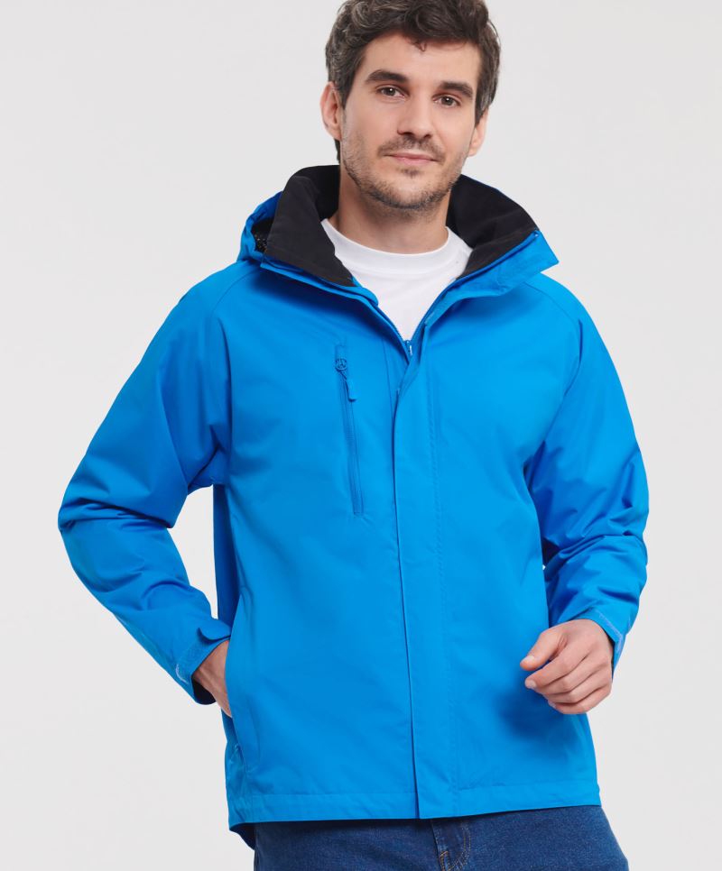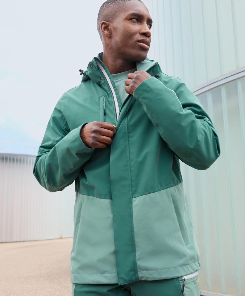 Klassischer Schnitt, wind- und wasserabweisend (3.000mm Wassersäule), atmungsaktiv (3.000g/m² in 24h), verstaubare Kapuze, 2 Seitentaschen mit Reißverschluss, Nähte versiegelt, entwickelt zum Trainieren bei nassen Bedingungen, weiches Netzfutter, feuchtigkeitsregulierend, 40° waschbar, nicht trocknergeeignet