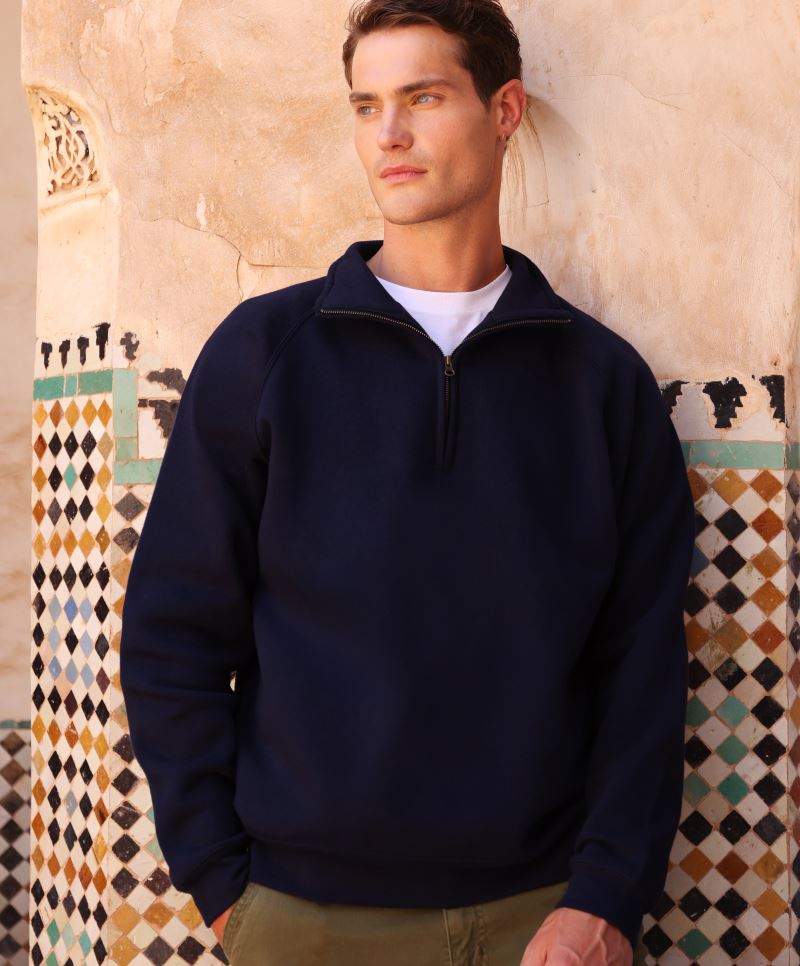 Klassischer Schnitt, Stehkragen, Raglanärmel, Rippstrickbündchen an Ärmeln und Saum mit Lycra®, verdeckter Metallreißverschluss, 2 Seitentaschen, Oberfläche aus 100% Baumwolle, innen angeraut, Verwendung nachhaltiger CiCLO®-Fasern, Tear Away Label, 40° waschbar, trocknergeeignet bei niedriger Temperatur