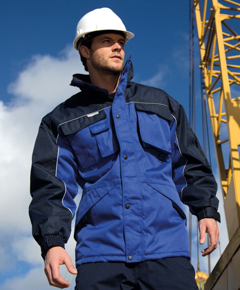 3-lagiges Softshellmaterial, wasserabweisend (8.000mm Wassersäule), umweltfreundliche wasserabweisende Ausrüstung (PFC frei), atmungsaktiv (5.000g/m² in 24h), Krageninnenseite aus Fleece, abnehmbare verstellbare Kapuze mit Kordelzug und Stopper, vorgeformte Ellbogen, Rippstrickbündchen an Ärmel und Saum, Kinnschutz, YKK Reißverschlüsse, 2 Seitentaschen mit Reißverschluss, keine zentralen Schulternähte, zertifiziert nach EN 14058:2017: 2, 3, X, X, reflektierende Details, 40° waschbar, trocknergeeignet bei niedriger Temperatur
