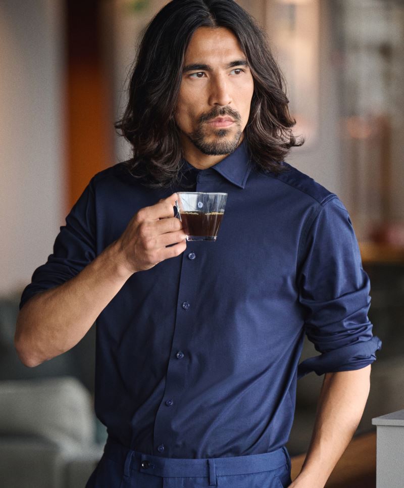 Klassischer Schnitt, verdeckter Button-Down Cutaway Kragen, Passe an Schulter und Rückenteil, verstellbare Manschetten mit 2 Knöpfen, Abnäher am Rücken, stretchiges Material, pflegeleichter Stoff, hergestellt aus langstapeliger Baumwolle, 40° waschbar, bügelleicht, nicht trocknergeeignet