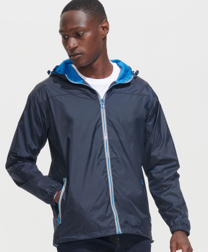 Wind- und wasserdicht (3.000mm Wassersäule) mit TPU-Beschichtung, atmungsaktiv (1.500g/m² in 24h), verstellbare Kapuze mit elastischer Kordel, Kinnschutz, 2 Seitentaschen mit Reißverschluss, Innentasche, Nähte versiegelt, Reißverschlüsse in Kontrastfarbe, Veredelungszugang am Rücken, reflektierende Details (ohne Schutzfunktion) an Kapuze, Vorder- und Rückenteil, 30° waschbar, Schonwäsche, nicht bügeln, nicht trocknergeeignet
