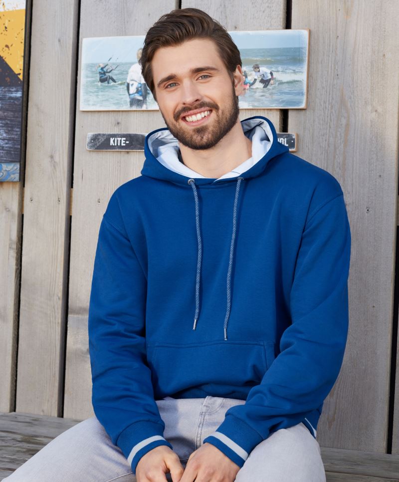 2-lagige Kapuze innen in Kontrastfarbe, Strickbündchen mit Elasthan, YKK Metallreißverschluss, Kängurutasche, Streifen in Kontrastfarbe an Ärmelbündchen und Bund, innen angeraut, 30° waschbar, Schonwäsche, trocknergeeignet bei niedriger Temperatur