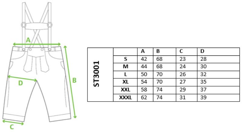 Traditionelle 3/4 lange Herren Lederhose, inkl. Träger und Brustschild, Stickereien an den Seiten und vorne