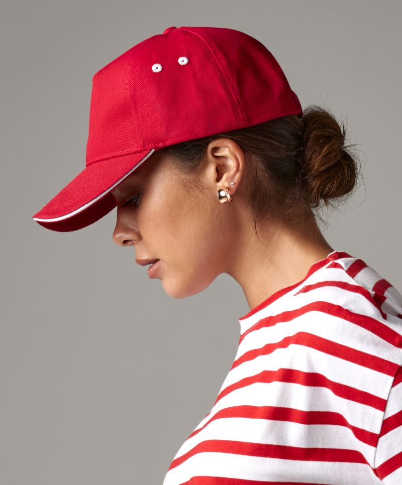 Hochwertige 5 Panel Kappe mit Sandwich in Kontrastfarbe, 6 Ziernähte am Schild, gefüttertes Schweißband aus Satin, Frontpanel laminiert, 4 gestickte Luftlöcher, Klettverschluss, 40° waschbar, Handwäsche, nicht bügeln, nicht trocknergeeignet