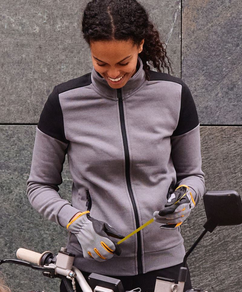 Stehkragen, Nackenband in Kontrastfarbe, Ärmelbündchen und Bund in 2x2 Rippstrick mit Elasthan, 2 Seitentaschen mit Reißverschluss, farblicher Kontrast an Schultern, Ärmelinnenseite und Reißverschlüssen, innen angeraut, 60° waschbar, trocknergeeignet bei niedriger Temperatur, nicht chemisch reinigen, Industriewäsche geeignet, Tasche zum Einnähen eines Wäschechips in der Seitennaht