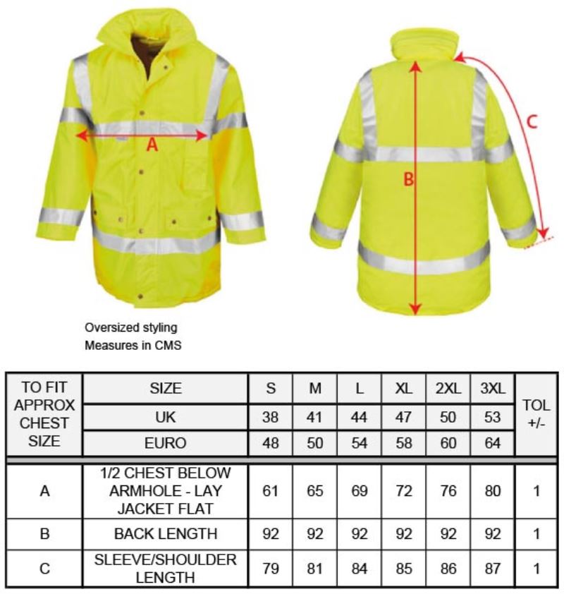 Wasserdicht (3.000mm Wassersäule), verdeckte Kapuze im Kragen, Windbremse an der Innenseite, 2 große Vordertaschen mit Patte, Handytasche, Innentasche, nahtlose Schulterbereiche, Nähte versiegelt, Veredelungszugang im Rückenfutter, Lüftungsöffnungen im Unterarmbereich, winddicht, EN ISO 20471:2013, Klasse 3 zertifiziert, entsprechend Norm EN343:2019 Klasse 3, 50mm breite aufgenähte reflektierende 3M™ Scotchlite™ Bänder, 40° waschbar, nicht bügeln, nicht trocknergeeignet