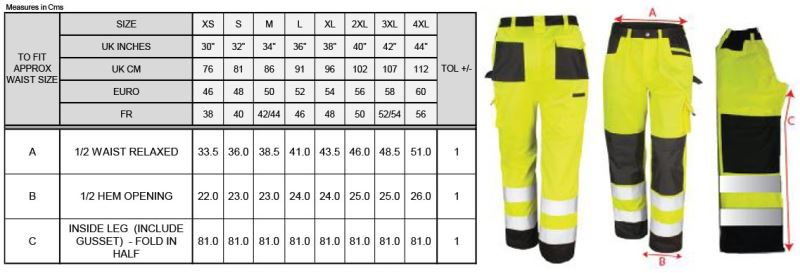Elastischer und hoch geschnittener Bund mit Gürtelschlaufen, Reißverschluss und Knopf, Cargotaschen seitlich, Eingrifftaschen seitlich mit zusätzlicher Reißverschlusstasche, Kniepolstertaschen, Multifunktionstaschen, Zollstocktasche, Einsätze in Kontrastfarbe (schwarz), Hammerschlaufe, Gewebe an stark beanspruchten Stellen verstärkt, EN ISO 20471:2013 Klasse 2 (GO/RT 3279 ISSUE 8:2013 Klasse 2 in Farbe orange), Reflexstreifen an den Beinen, Label zum Abschneiden, 40° waschbar, nicht bügeln, nicht trocknergeeignet