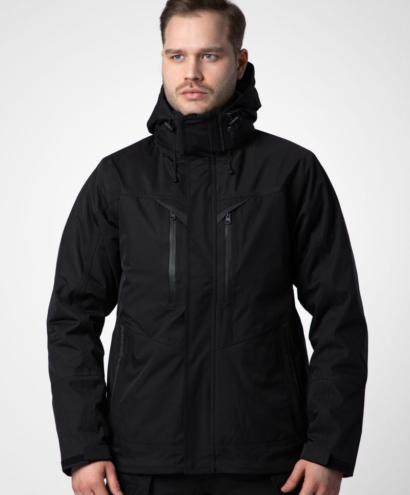 Wasserdicht (6.000mm Wassersäule), atmungsaktiv (1.000g/m² in 24h), abnehmbare verstellbare Kapuze, verstellbare Ärmelbündchen mit Klettverschluss, wasserdichter Reißverschluss, Windschutzleiste mit Druckknöpfen, 2 aufgesetzte Taschen mit Druckknöpfen und seitlichem Reißverschluss, Nähte versiegelt, Reißverschluss innen zum Befestigen der Innenjacke, Veredelungszugang an Rücken und linker Brust, Lüftungsöffnungen im Unterarmbereich, Aufhänger, knitterfrei, winddicht, Innenjacke: elastische Bündchen an Arm- und Bundabschluss, durchgehender Reißverschluss, 2 Seitentaschen mit Reißverschluss, Steppdesign, Aufhänger, neutrales Größenlabel, 30° waschbar, nicht bügeln, nicht trocknergeeignet, nicht chemisch reinigen