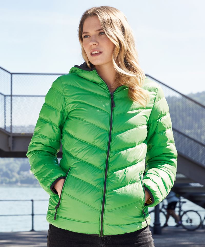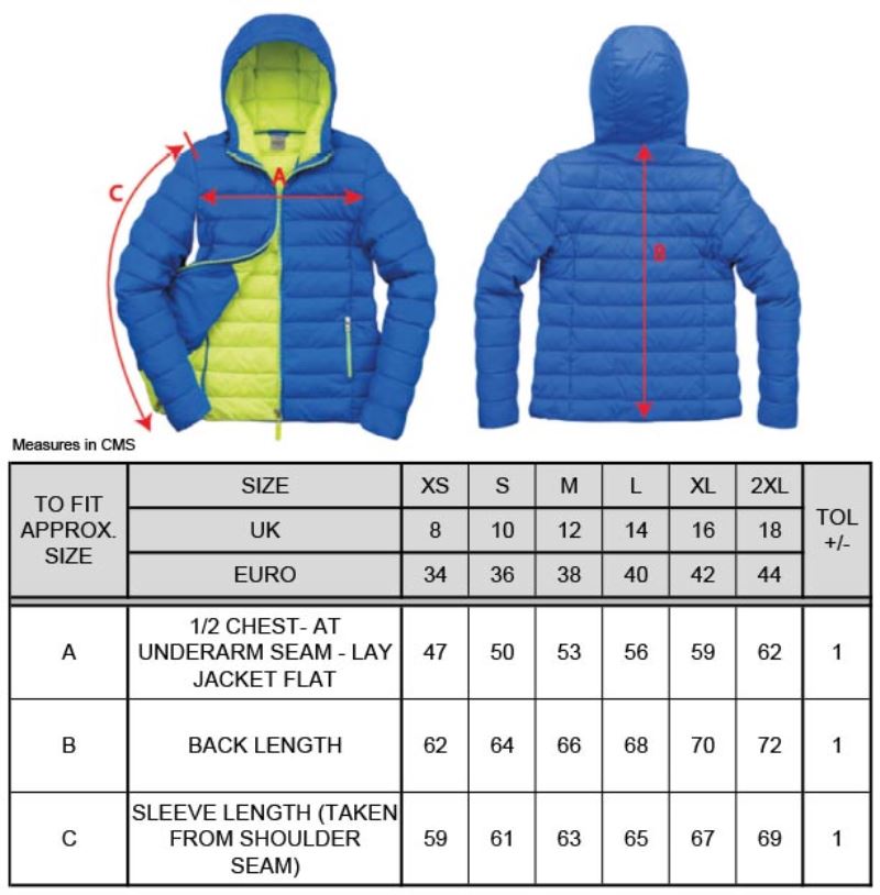 Taillierter Schnitt, verstellbare wattierte Kapuze, elastischer Armabschluss, 2 Seitentaschen mit Reißverschluss, Innenfutter und Reißverschlüsse in Kontrastfarbe, ideal für den ganzjährigen Gebrauch, weiches Material, kann klein verpackt werden, 40° waschbar, Schonwäsche, nicht bügeln, nicht trocknergeeignet