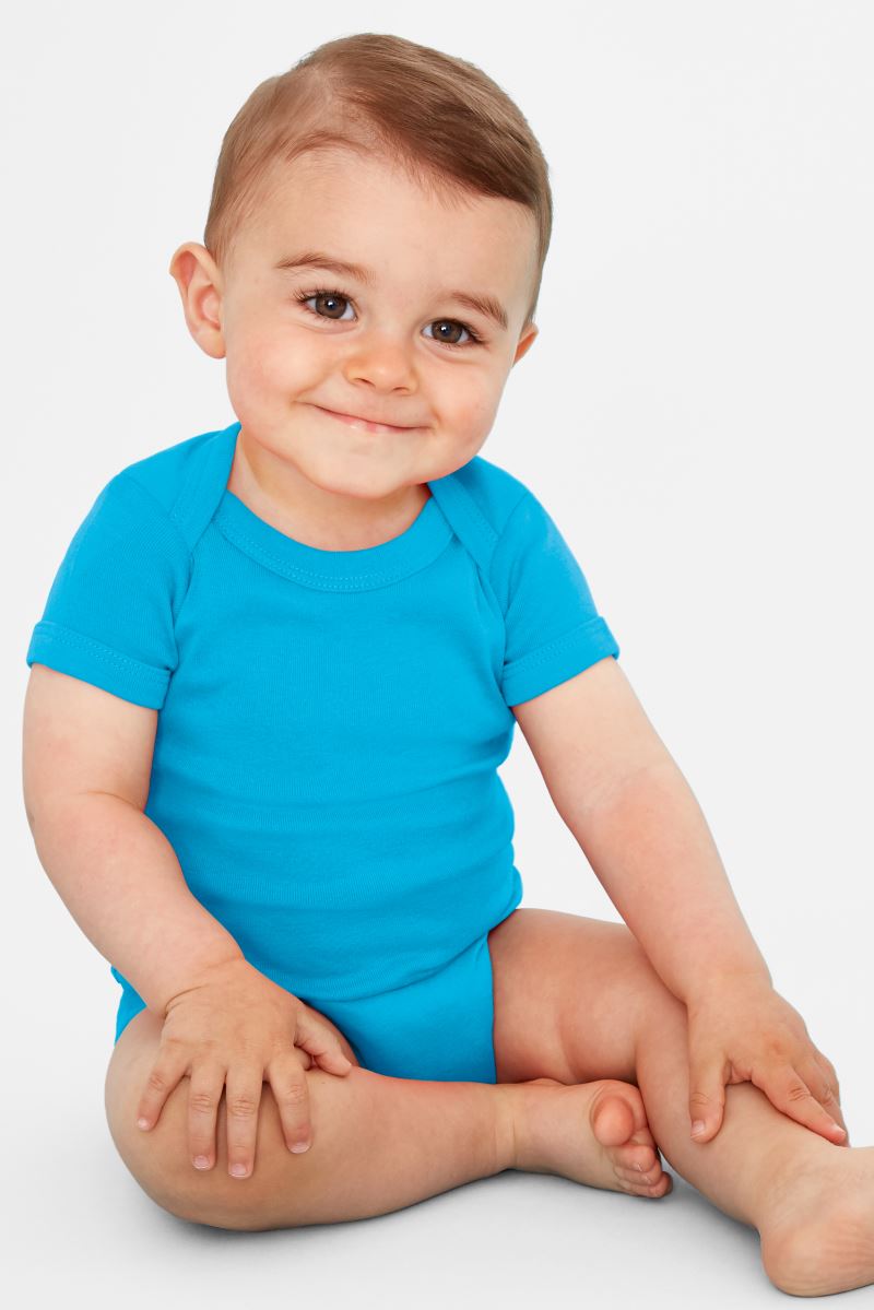 Überlappender Rundhalsausschnitt, Druckknöpfe im Schritt, Blenden in Kontrastfarbe an Hals, Arm und Bein, 1x1 Rippstrick, Tear Away Label, neutrales Größenlabel, 40° waschbar, nicht trocknergeeignet